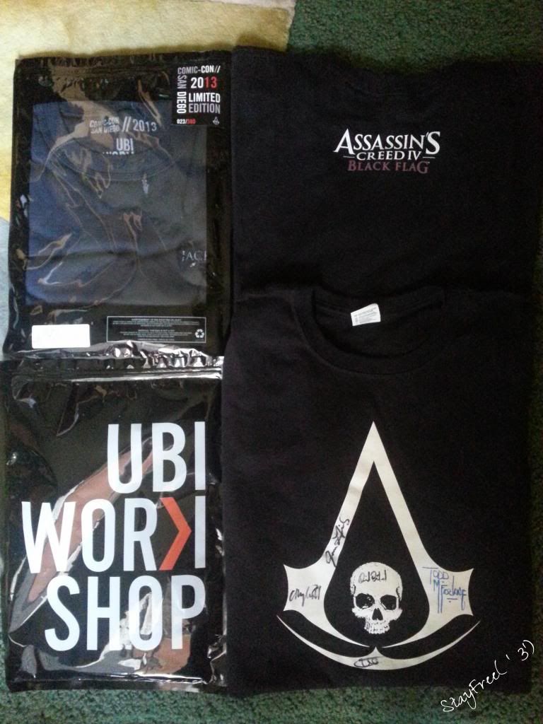 The bags on the left are the shirt and hoodie, while the ones on the right are from the ship and Ubisoft booth.