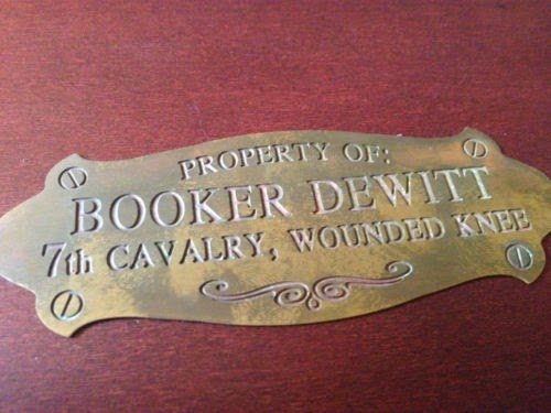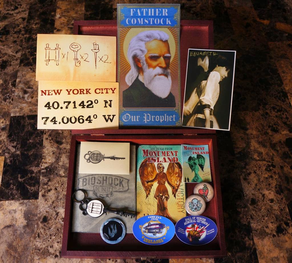 ![]() ![]() Item: Booker DeWitt Box Replica Description: press kit Year: 2013 Publisher: 2K Content: - Booker DeWitt's wooden box, mounted with brass name plaque - Metal C.A.G.E keyring - A Columbia guidebook - Monument Island Sticker - Monument Island postcard - Bioshock key-shaped USB stick - Father Comstock fabric print - Photo of Elizabeth - 2 Vigor pin badges - Lighthouse entry code postcard - Hall of Hero's Sticker - First Lady Aerodrome Sticker - NYC coordinates Post Card Amount: not specified, but according to sources it's around 20. |